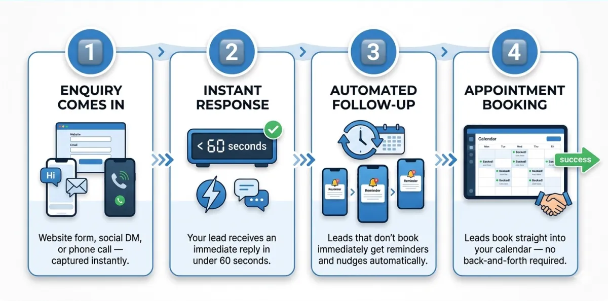AI responds to enquiries from your website, Google, and social media - answering questions, qualifying leads and booking appointments in your brand’s voice.